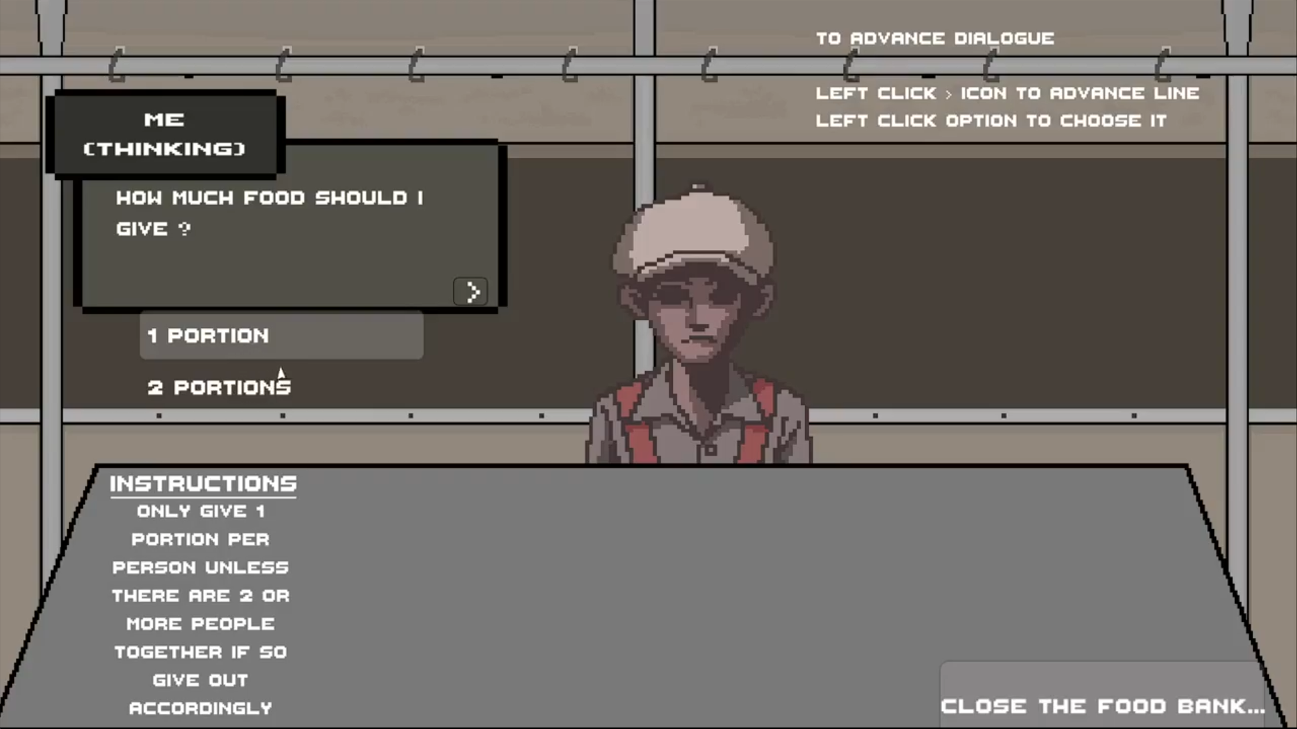 The game puts you in charge of running a food bank in this world. As a visual novel, players make choices about whether to give food to the people in front of them but crucially, there are no gameplay consequences for your decisions. The design intent was to challenge the player's moral compass, not punish or reward it.