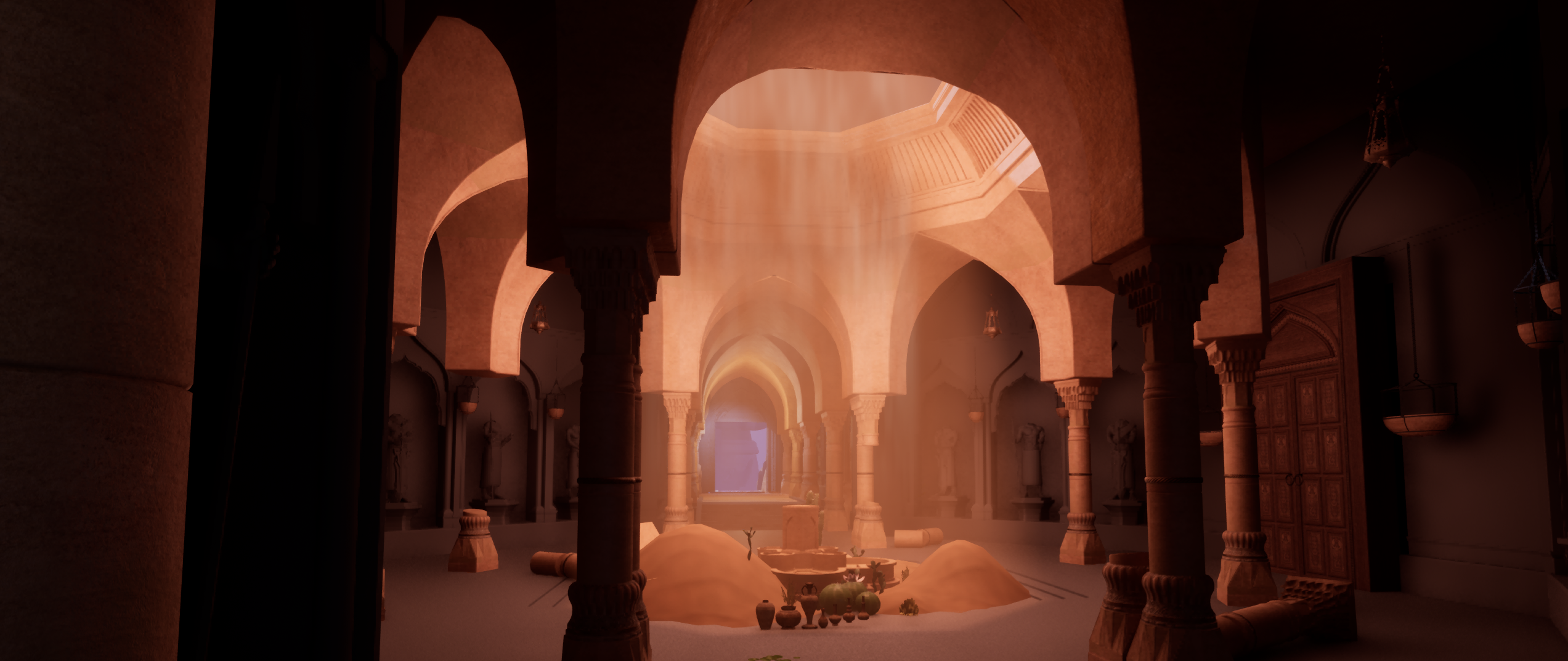 Every aspect of the world was researched to represent the culture as authentically as possible. The main arena draws directly from mosque architecture: minarets, ablution fountains, faceless statues, and a mihrab all tie together the setting's visual identity. The contrast between the outer desert and the cosmic sky inside the arena pushes the fantasy register forward, grounding the world in something real while making space for the mythological. This setting is severely underrepresented in games, and getting it right mattered.